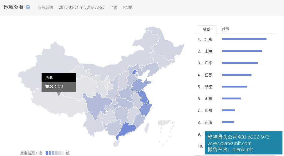 由上圖可以看出,2015年3月1到25日,全國搜索獵頭省份前十分別是: